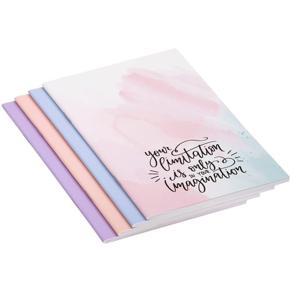 Todas as folhas são pautadas e a linha preta. O tamanho perfeito para carregar na bolsa. Um caderno vem com a capa escrita: “Your Limitation is only in your imagination” (“Sua limitação está apenas na imaginação”) e os outros três cadernos com as capas em tons pasteis ( rosa, lilás, azul).