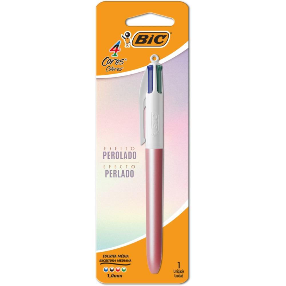 A Caneta BIC 4 Cores e um icone de mercado! Este modelo conta com tintas classicas, com apenas um clique no botao, voce seleciona a cor que deseja. A Caneta ainda possui corpo perolado rosa, dando um ar vibrante e refinado a essa caneta tao tradicional da BIC. Conta com escrita media com ponta de 1mm com largura da linha de 0.4mm. Alem disso, nao trava durante o uso!