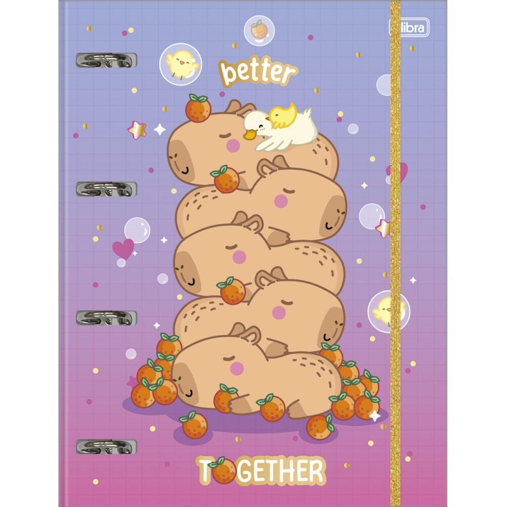O Caderno Argolado Cartonado Universitario com Elastico Capyclub 48 Folhas da Tilibra combina praticidade e estilo, com capa dura metalizada, elastico, parte interna decorada, adesivos, bolsa plastica e folhas pautadas e decoradas, ideal para organizar suas anotacoes.