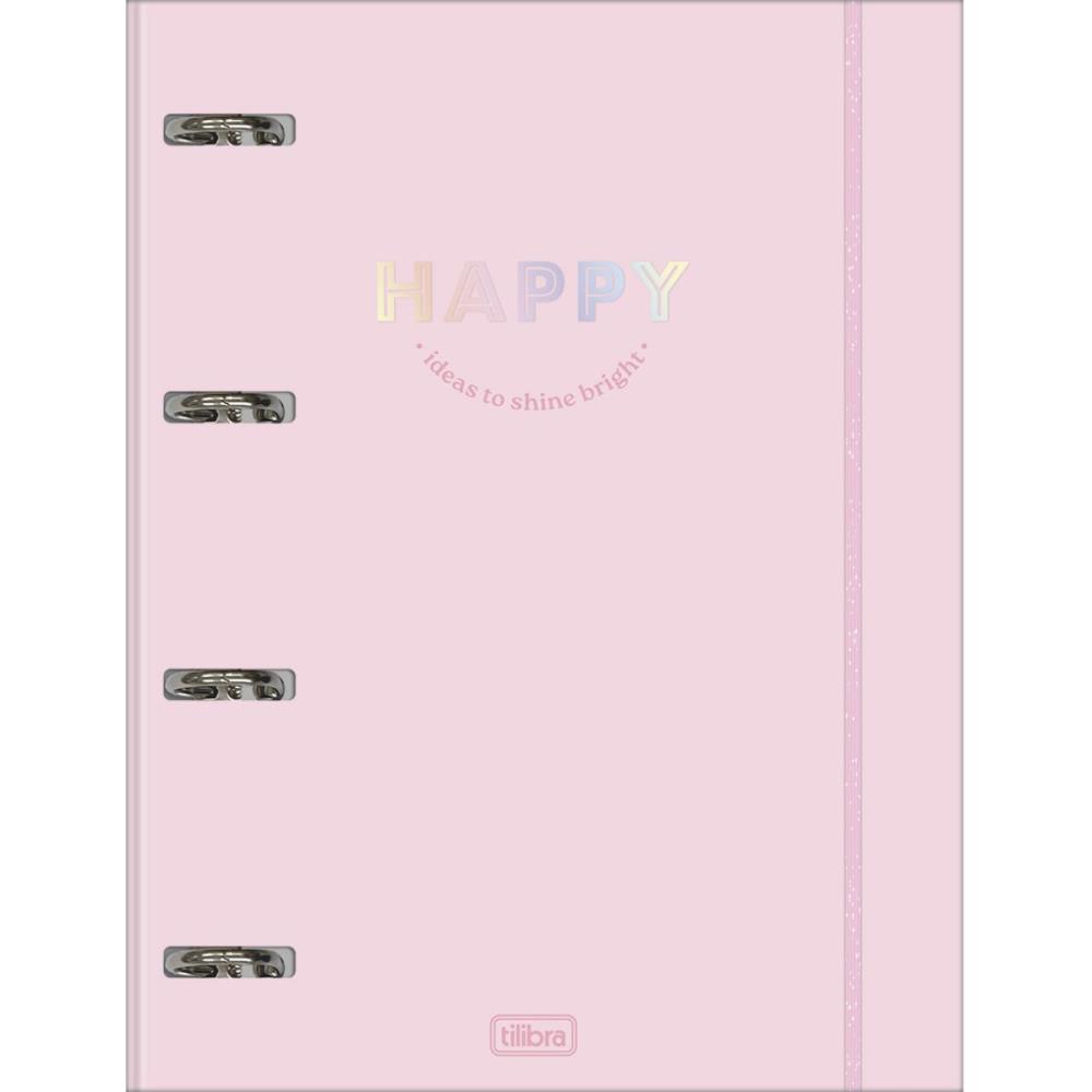 O Caderno Argolado Cartonado Universitario com Elastico Happy 48 Folhas da Tilibra combina praticidade e estilo, com capa dura metalizada, elastico, parte interna decorada, adesivos, bolsa plastica e folhas pautadas e decoradas, ideal para organizar suas anotacoes.