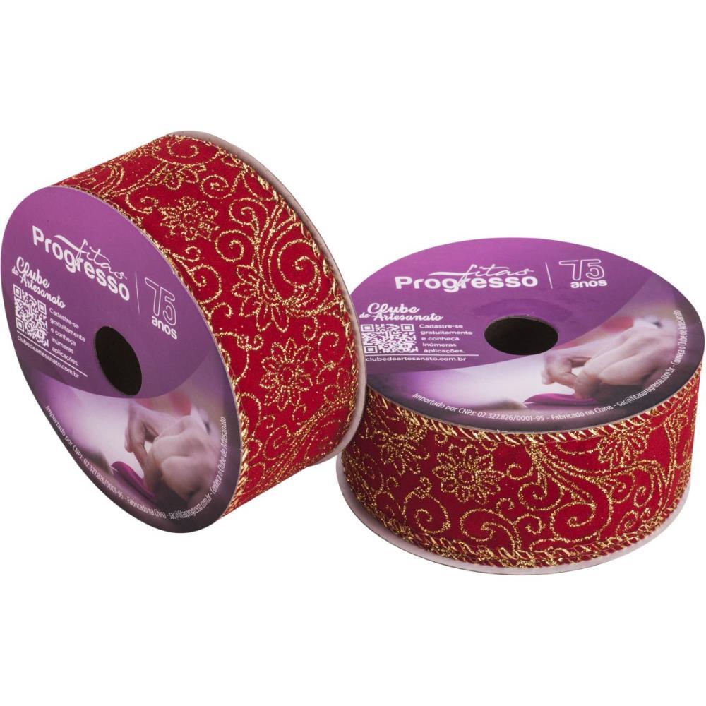 Fita Aramada Natal 38 mm x 10 metros Veludo Vermelho com Arabesco - Fitas Progresso