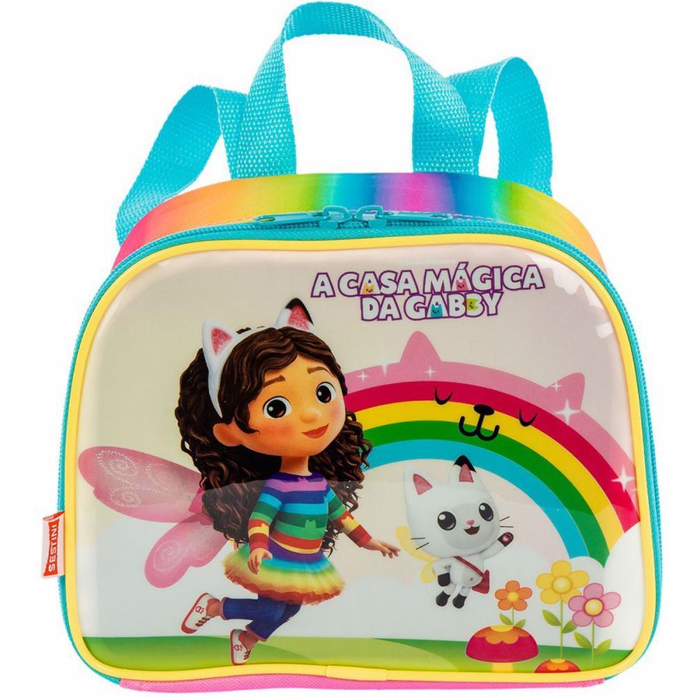 A lancheira da Gabby completa a colecao com as cores do arco-iris e a praticidade de levar alimentos e bebidas com seguranca. Ela tem compartimento resistente a liquidos e facil de limpar, alca de costas ajustavel e alca carona, para levar junto do carrinho da mochila. *Produto SESTINI certificado pelo INMETRO Registro 0034042018 - OCP - 0061.*