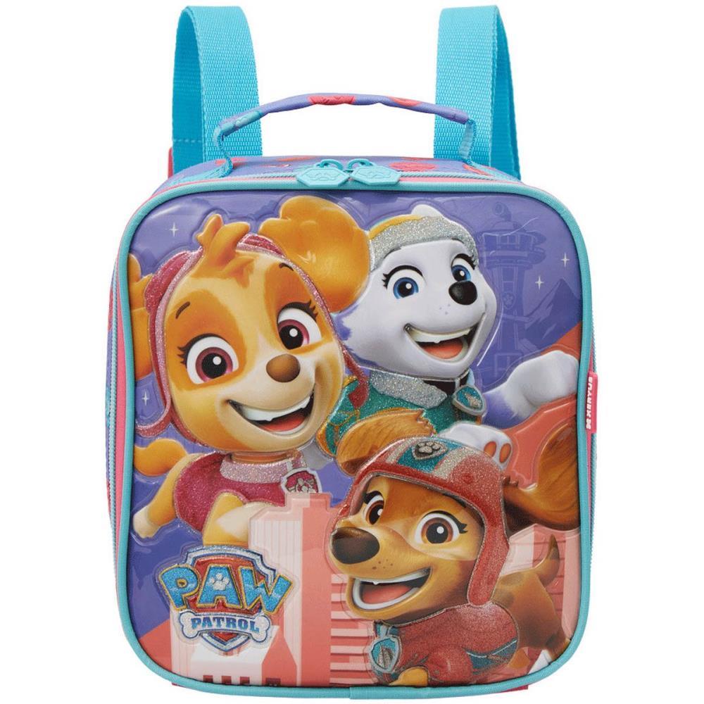Lancheira - Produzida em poliester 420D estampado com frente em PVC Cristal com glitter aplicado . Compartimento com revestimento em material que ajuda a manter o frescor dos alimentos por mais tempo. Puxadores personalizados . Alcas regulaveis com faixa para acoplar o produto na haste da mala de rodinhas. Produto certificado.