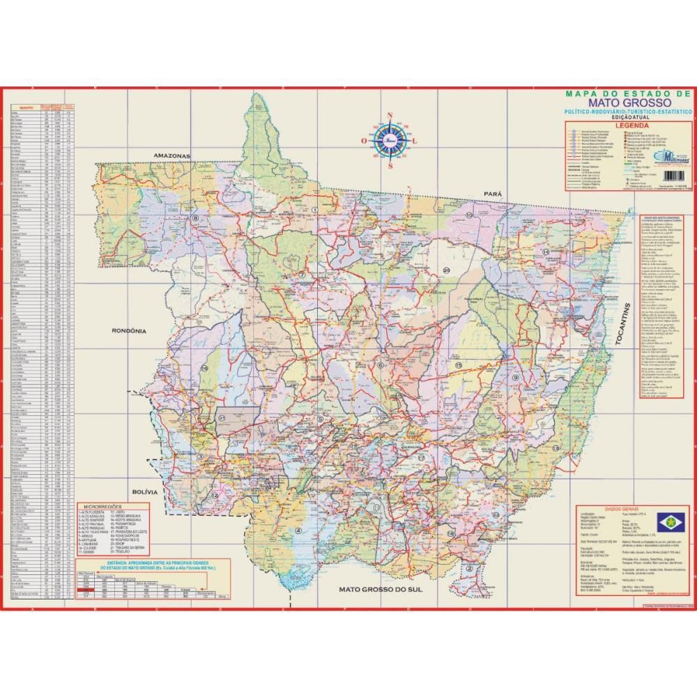 Mapa dobrado, com divisão política, contendo todas as cidades do estado, todas suas divisas, população e principais estradas do estado.