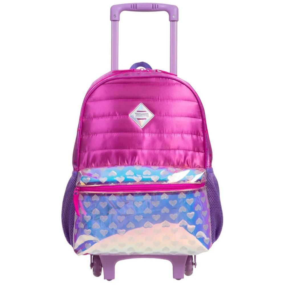 Uma mochila com uma linda estampa colorida, produzida em um resistente poliester para te acompanhar na escola. As alcas espumadas possuem regulagem, para o melhor ajuste no corpo, e o carrinho com rodinhas torna o transporte mais facil e leve. Os bolsos laterais em redinha acompanham a paleta de cor da Mochilete, e o bolso frontal possui coracoes com glitter em um material holografico.