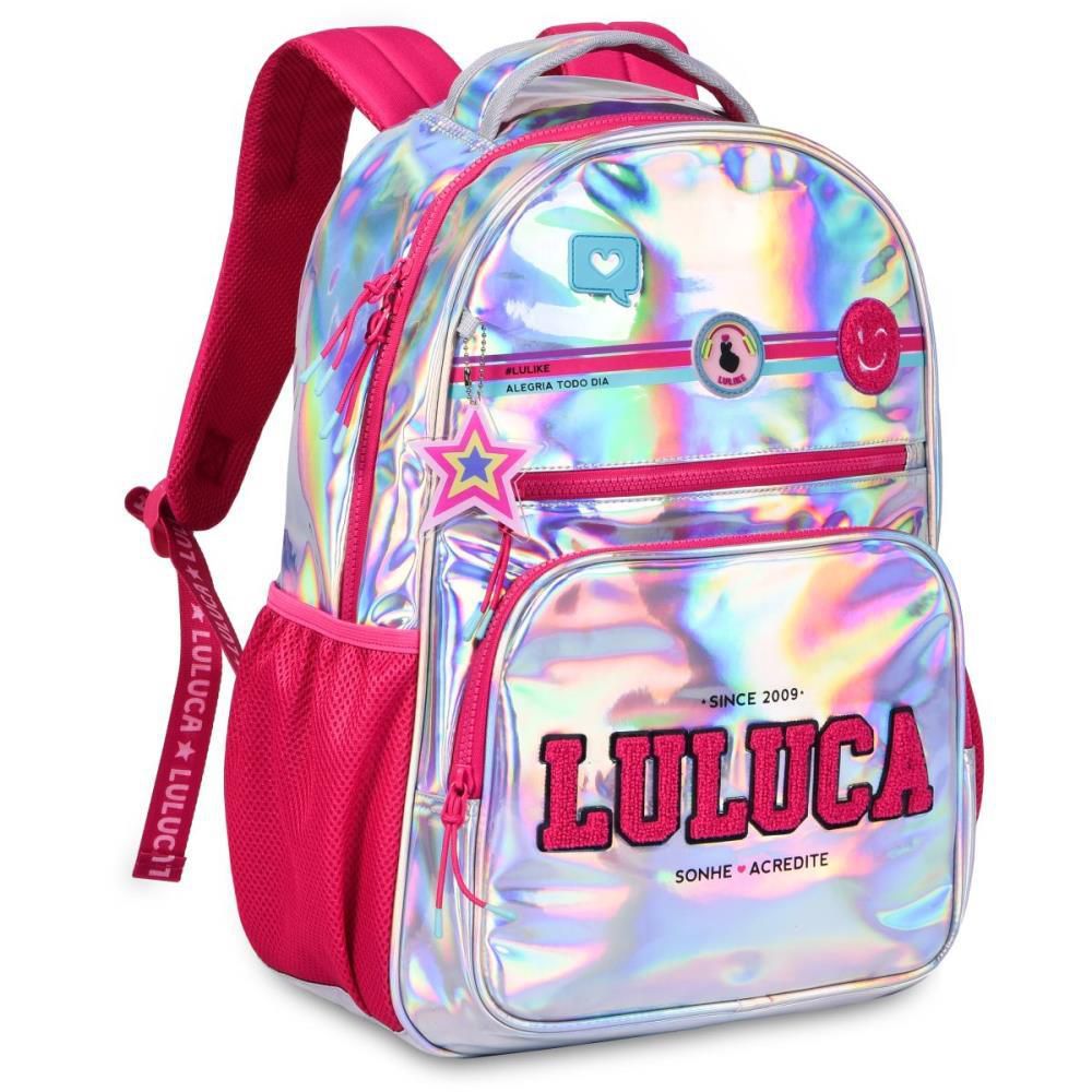 Confeccionadas em PVC holografico com silk, tags e patches no painel frontal. Mochila com chaveiro de acrilico.