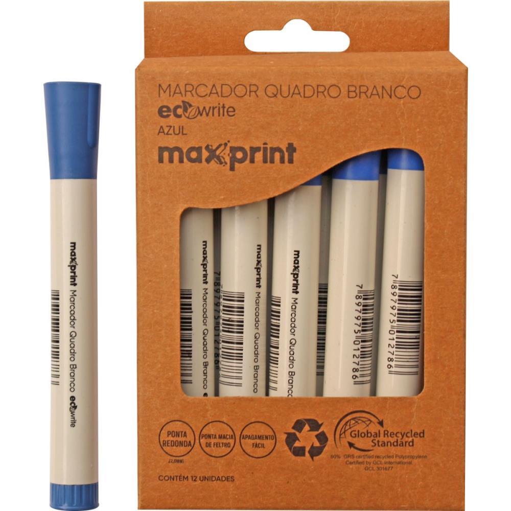 O marcador para quadro branco Maxprint Ecowrite azul e ideal para uso em sala de aula com apagamento facil. Possui composicao em plastico reciclado e ponta redonda de 2,0mm em feltro. Sua tinta alema possui pigmentacao mais uniforme e melhor performance.