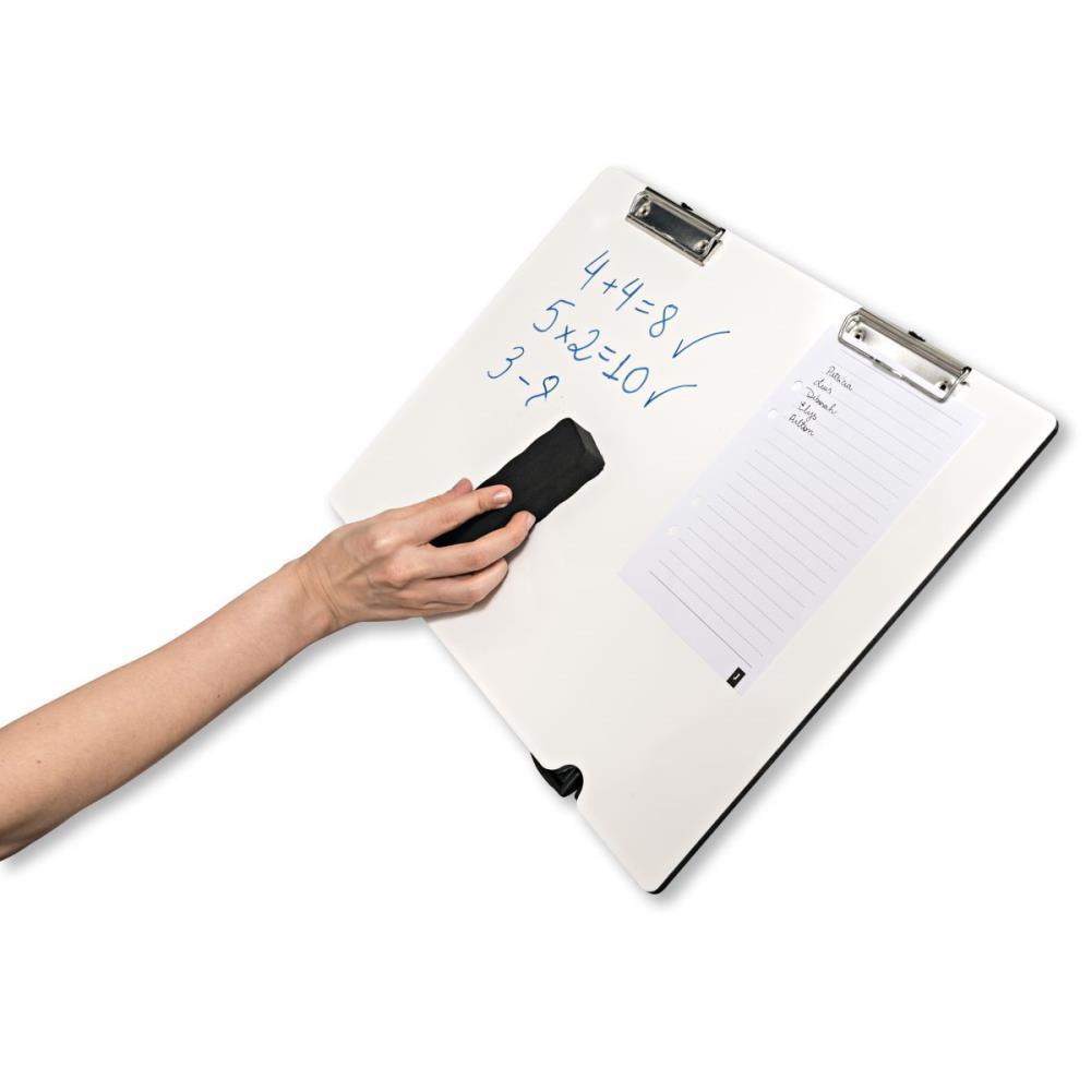 Prancheta para desenho com prendedores de papel. Acabamento em UV na cor branca permitindo o uso de marcadores para quadro branco. Com suporte em plástico fixado permitindo 3 níveis de inclinação para desenhar: 15°, 30°, 45°, antiderrapante, apoio para revistas e livros. Pranchetas para papel a A4 e A3.