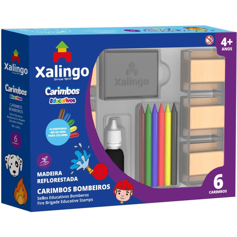 A linha de carimbos  Educativos da Xalingo  e composta por  diferentes modelos. Cada tema vem com 6 carimbos de madeira, 01 almofada com tinta atoxica, giz de cera e um 01 bloco de papel. Sao desenhos super divertidos que vao encantar a criancada.  Estimula a coordenacao motora, a criatividade e imaginacao. Indicado para criancas acima de 4 anos.