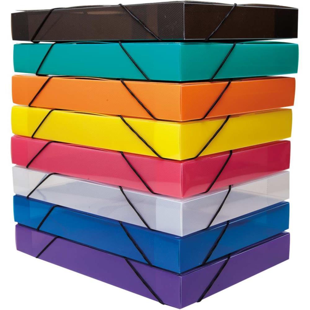 Pasta aba elástico em polipropileno. Possui abas para fixar os documentos no interior da pasta e elástico para fechamento. Produto certificado pelo INMETRO.